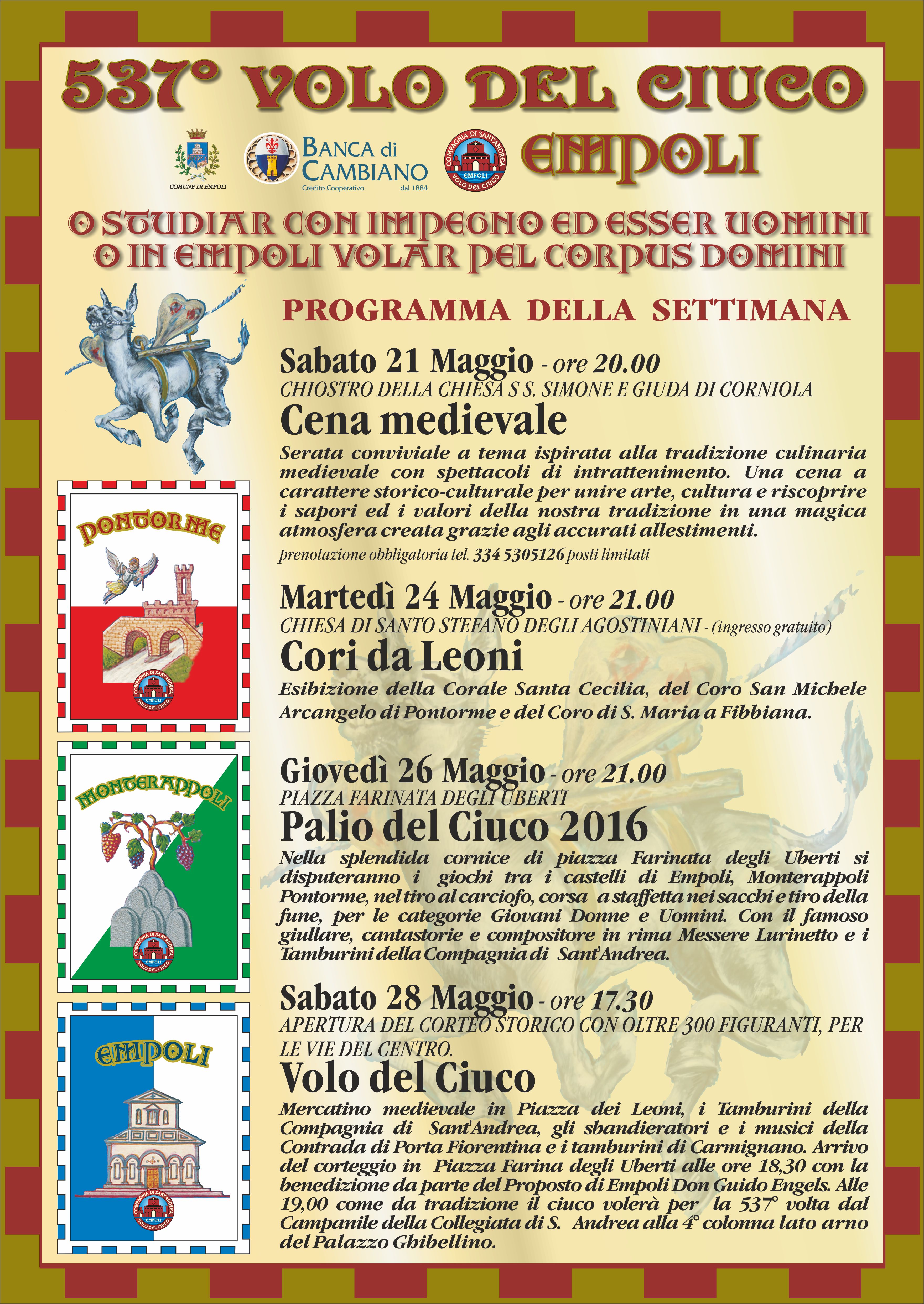 Nel suggestivo scenario del chiostro della chiesa dei SS. Simone e Giuda a Corniola, frazione di Empoli, si svolgerà la tradizionale cena a tema medievale che da anni inaugura la settimana del Volo del Ciuco. Grazie a una sempre più attenta cura dei dettagli, la serata sarà un’occasione per riscoprire i sapori della tradizione culinaria medievale,con spettacoli di intrattenimento a tema.Prenotazione obbligatoria al 334 5305126 (posti limitati)